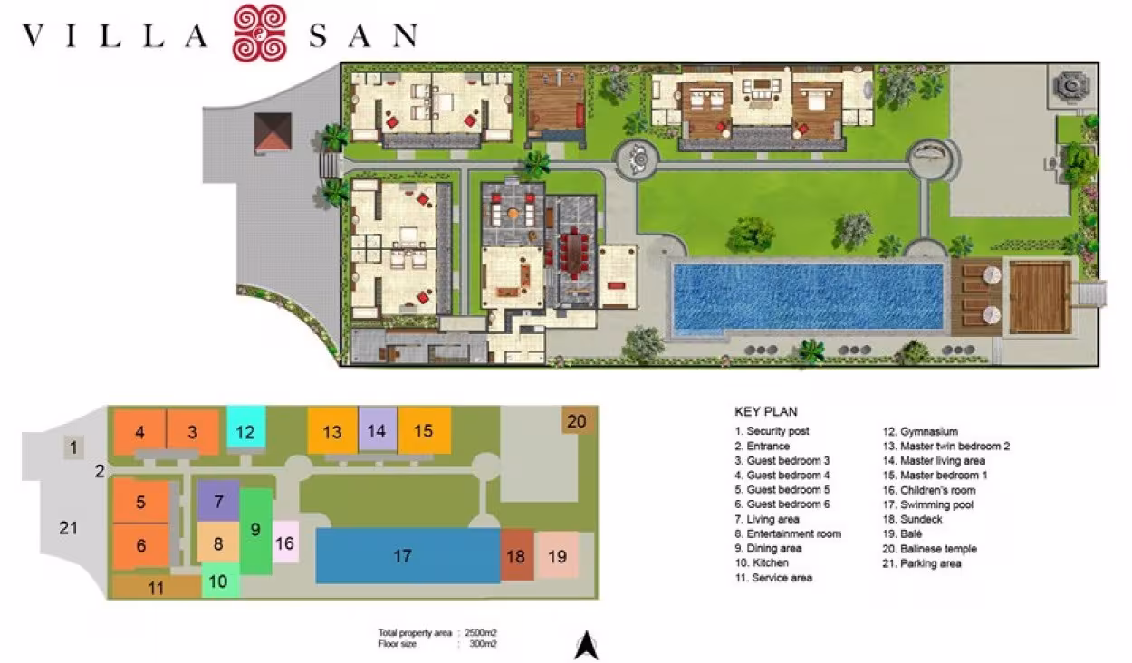 Просторная территория виллы предлагает свободу и гибкость как для семей, так и для компаний друзей: вокруг 25 x 5 м бассейна расставлены гамаки и шезлонги, а у бассейна находится павильон с местами для 15 человек. Внутри, помимо гостиной и обеденной зон, есть две хорошо оборудованные комнаты для развлечений – одна является частью главного двухспального люкса, другая расположена рядом с неформальной обеденной зоной. Также в вилле есть тренажёрный зал и игровая комната для детей. В интерьере представлены изысканные произведения искусства и ремесленные изделия из Китая, Ганы и Индонезии.